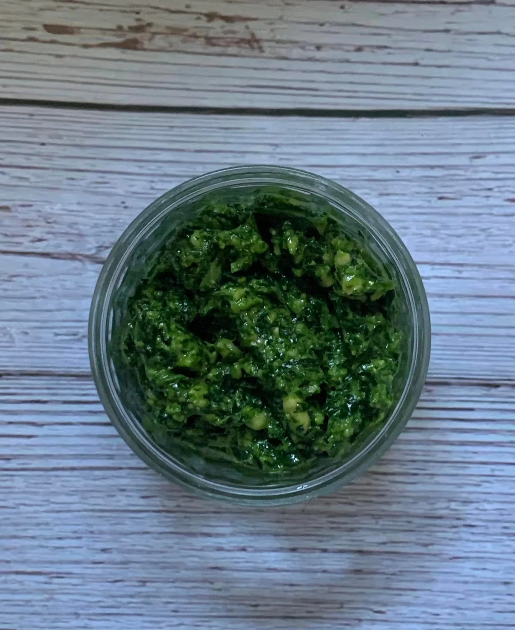 Rinse the wild garlic and pat it dry thoroughly before use. In a mini food processor, whizz up the pine nuts to form a crumb. Set aside. Then roughly chop the wild garlic and add it to the processor with enough oil to get it going. Add the fine sea salt and pulse the salsa streaming in more oil so it’s a chunky paste. Pulse the crumbed pine nuts through so they are well-dispersed.