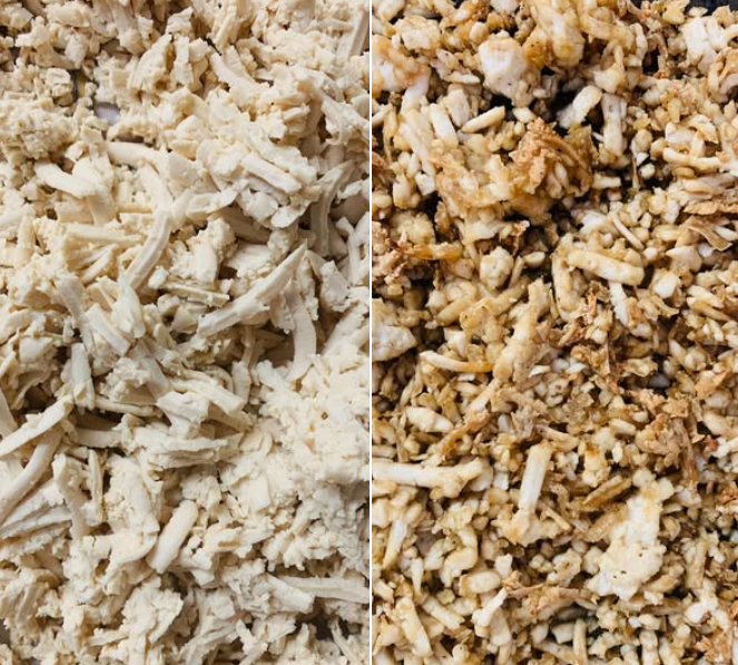 Grating the tofu and baking at a high temperature is important to get the chewy texture.